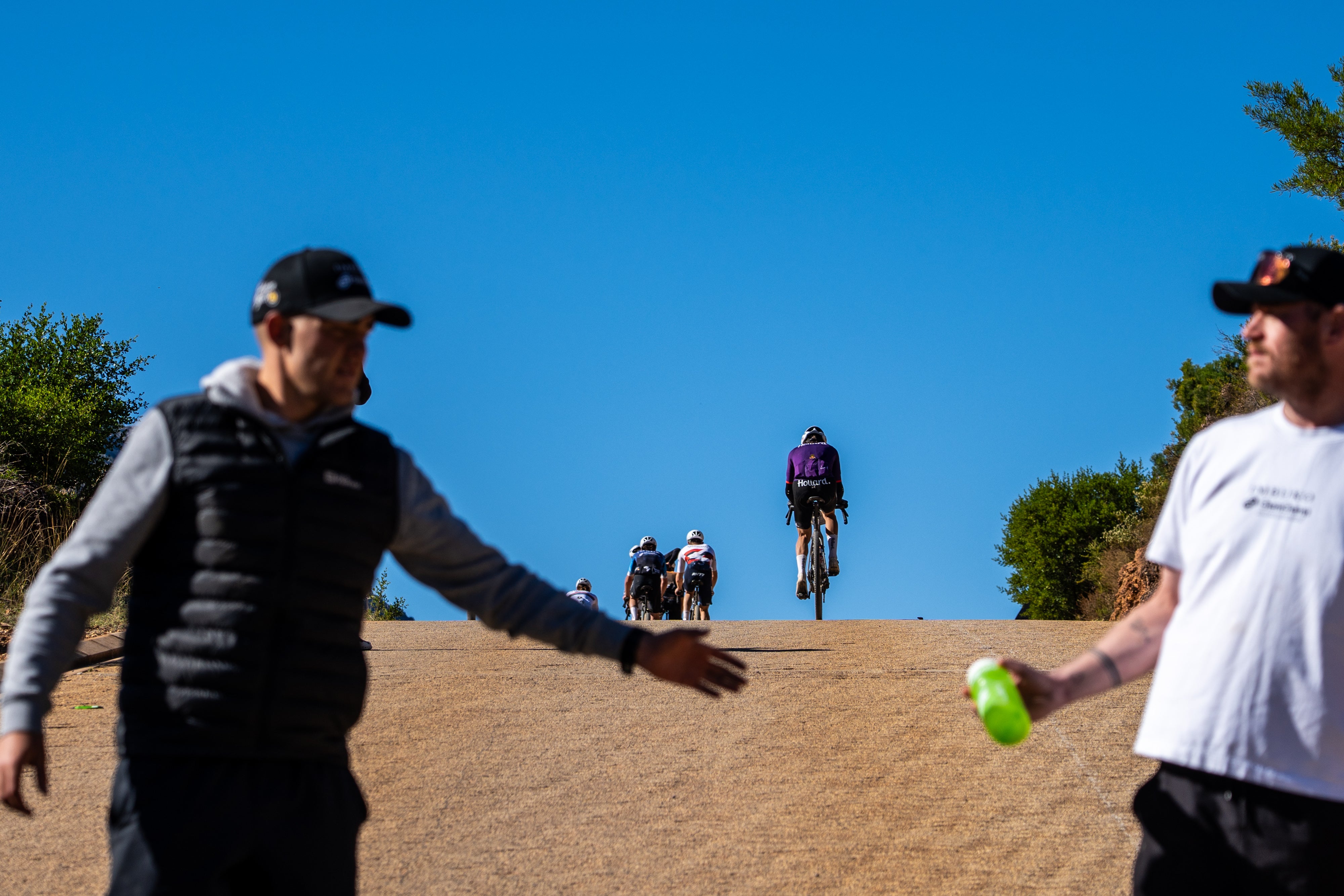 The Ceder Gran Fondo begins at Nuwerust Farm, where riders navigate a few winding turns and cross a low water bridge before passing the original venue, Cederberg Oasis. Take a moment to salute the iconic smiley face sign! The route features a short climb from Oasis, followed by a rapid descent that leads over two more low water bridges, usually flowing with Cederberg water. After passing through Matjiesrivier Nature Reserve, riders ascend toward the vineyards of Sanddriff and Cederberg Wines, encountering a challenging 35km stretch before a stunning descent down Uitkyk Pass.